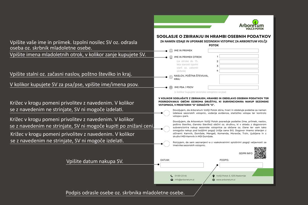 Novi imetnik sezonskih vstopnic mora podpisati soglasje o hrambi osebnih podatkov za namen izdelave sezonske vstopnice. Za dostop do obrazca kliknite TUKAJ. Navodila za izpolnjevanje obrazca so spodaj.