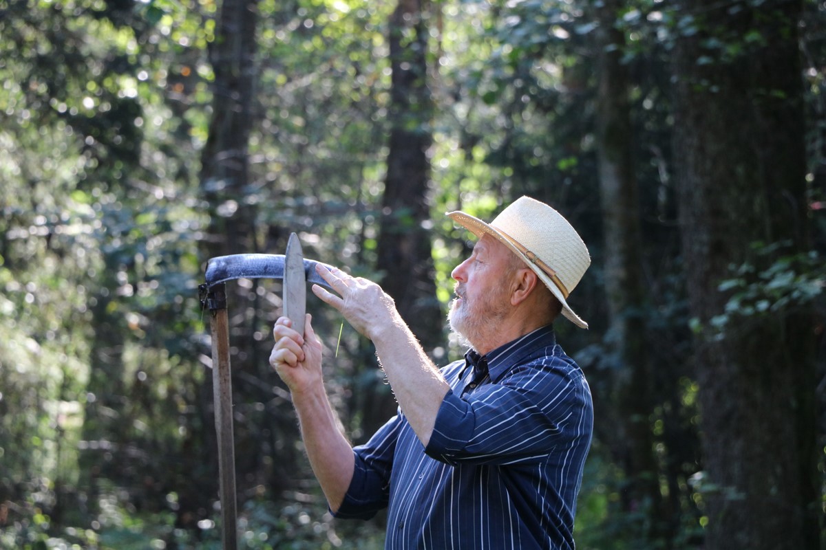 Namen te fotografske delavnice je bil prikazati redka, dragocena znanja in spretnosti. Predstavljena je bila košnja otave, dogajanje je bilo pa tako dinamično in zanimivo s polno nasvetov, saj je animator Peter prikazal ves postopek od klepanja kose, košnje, sušenja, obračanja, dajanja v kopice … Zaupal je tudi marsikatero posebnost, ki smo jo fotografi vsi navdušeni takoj uporabili.