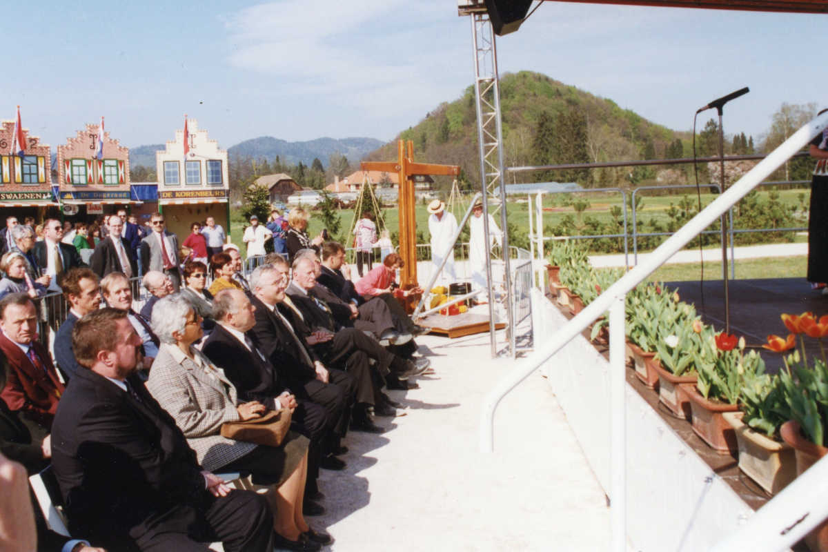 Cvetlični slavolok nad sprehajalno potjo v Arboretumu Volčji Potok na stari fotografiji, obiskovalci med drevesi
