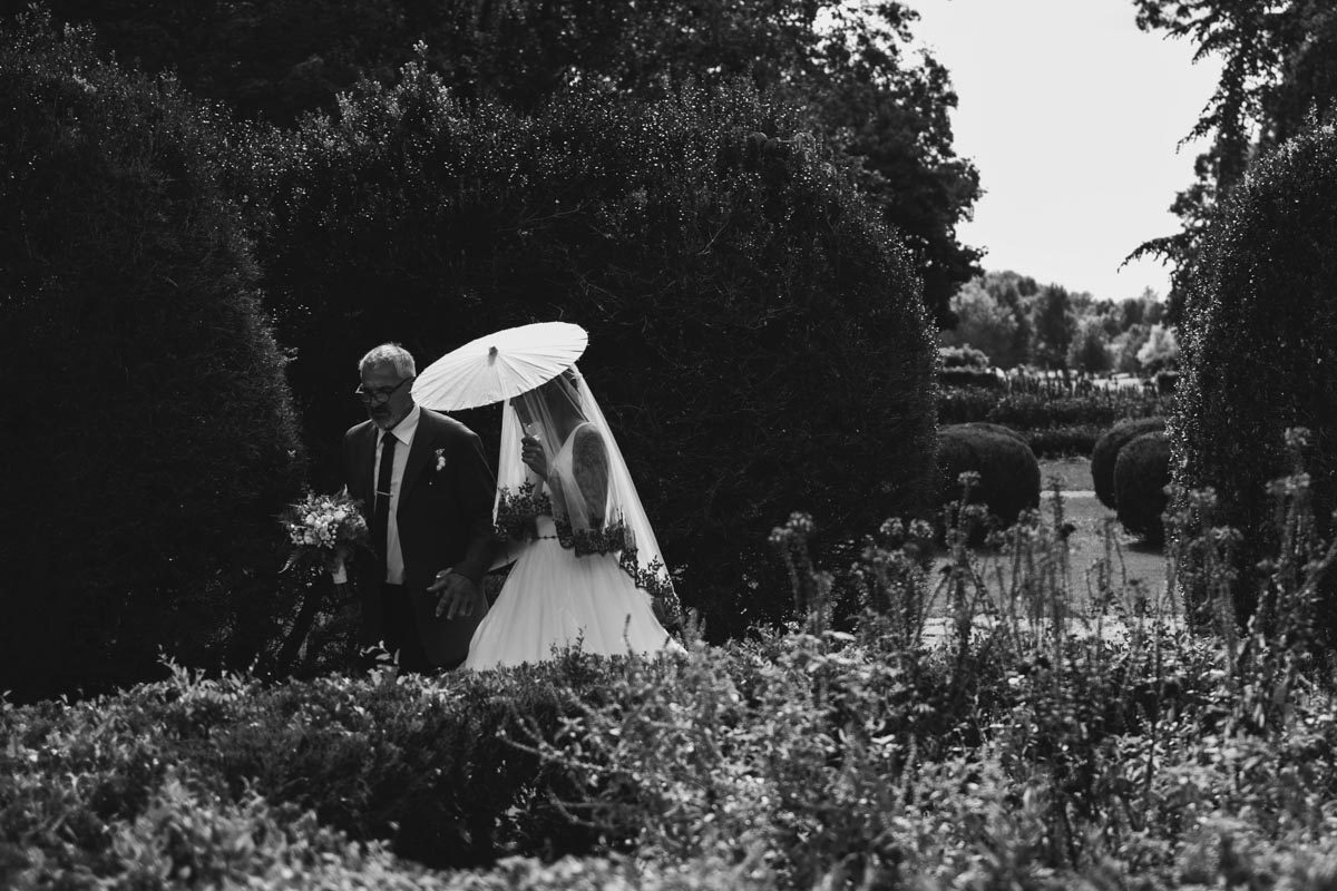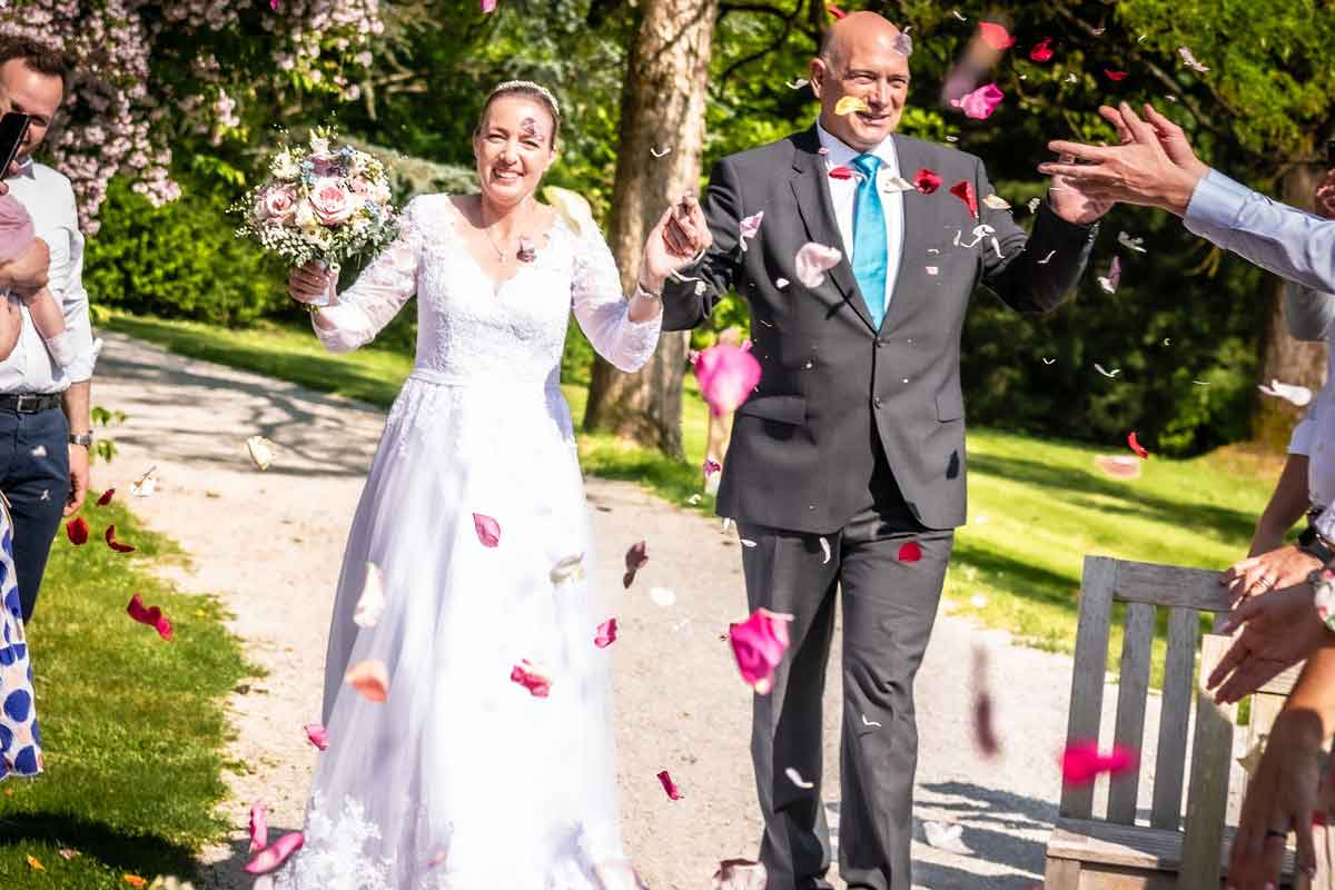 Svatje se zberejo pred vhodom v park. Par skozi kostanjev drevored v sprevodu popelje svate do lokacije poročnega obreda. Obredu sledi zdravica, druženje s svati in fotografiranje. Pogostitev s penino se izvede na lokaciji poročnega obreda, v njeni neposredni bližini ali pa se izbere prostor drugje v parku, da si lahko svatje med sprehodom ogledajo park in se na ta način popestri dogajanje poročnega dne. Paru v parku ni treba hiteti. Z gosti se lahko v parku zadrži dve uri, zato se lahko par mirno posveti druženju s svati in fotografiranju. Za dostop do poročne lokacije lahko par najame električni cestni vlak (za do 56 odraslih oseb).